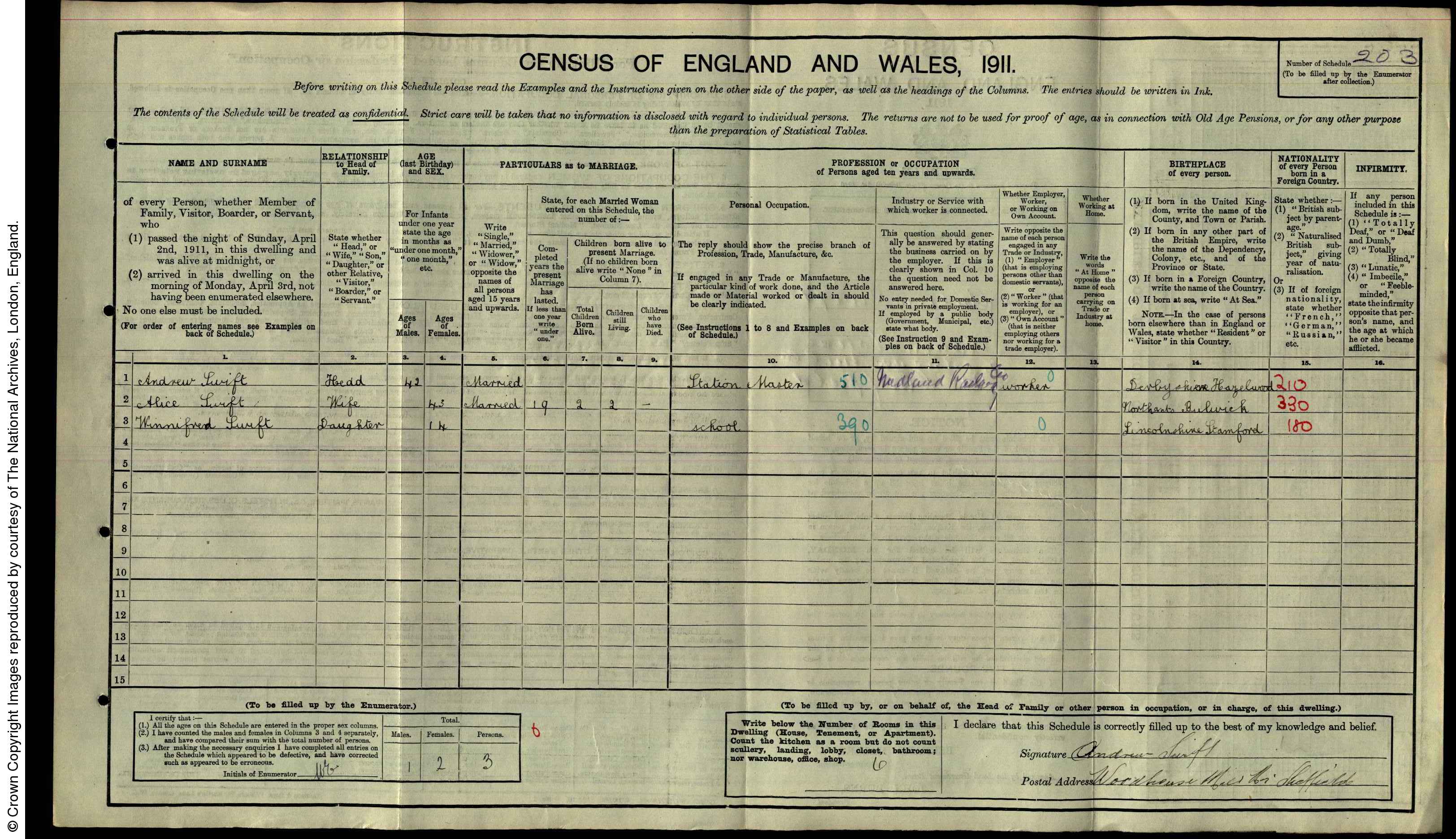 In the 1891 census Andrew was a Railway Porter lodging with the Clements family in Harborne, Staffordshire. On the 15th August 1892 he had married Alice Scotney Then by the 1901 census Andrew was a Station Master at Bolton upon Dearne which is between Doncaster and Barnsley. By this time Andrew and Alice had two children, Winifred Emily Swift and Alice Mahalla Swift.